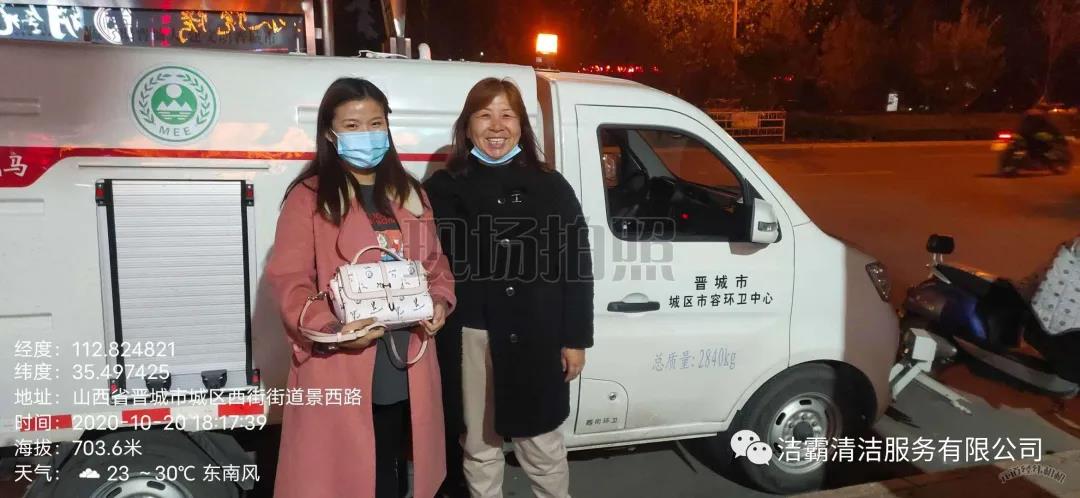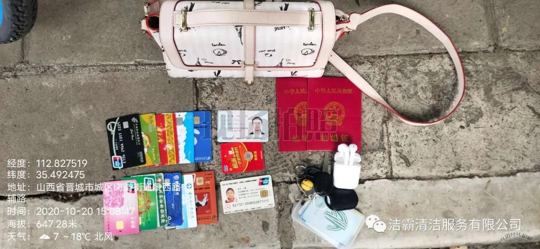 10月20日下午3點(diǎn)左右,晉城市潔霸清潔服務(wù)股份有限公司保潔部環(huán)衛(wèi)經(jīng)理李通和工人在城區(qū)南街街道景西路段進(jìn)行街道清洗作業(yè)時(shí),忽然看見晉城農(nóng)商銀行門前的綠化帶里有一個(gè)女士挎包,忙叫環(huán)衛(wèi)工人郭志云把挎包撿了起來。當(dāng)時(shí)就考慮到失主丟失挎包以后一定很著急,在同事的共同見證下他們打開挎包,經(jīng)過查看,發(fā)現(xiàn)挎包內(nèi)有一張王女士的身份證、社?般y行卡數(shù)張,還有結(jié)婚證、鑰匙、耳機(jī)、富士康工牌等物品。憑借富士康工牌上的工號,他們給富士康打電話聯(lián)系到了失主,后由環(huán)衛(wèi)主管秦彩鳳將挎包交到失主手中。收到失而復(fù)得的挎包,王女士又驚又喜,感激萬分。