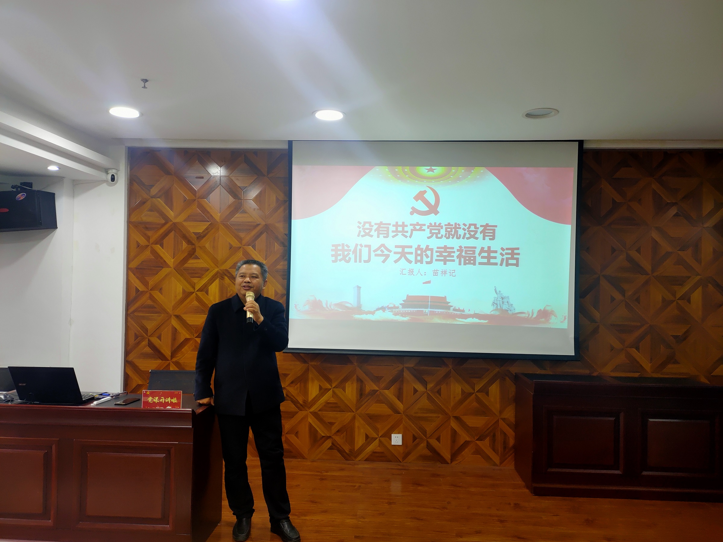 黨課中,苗祥記校長(zhǎng)以“沒(méi)有共產(chǎn)黨就沒(méi)有我們今天的幸福生活”為主題,從1901年清政府簽訂喪權(quán)辱國(guó)的《辛丑條約》講起,引用大量翔實(shí)、生動(dòng)的歷史資料,對(duì)“十月革命”、中國(guó)共產(chǎn)黨的誕生、創(chuàng)建井岡山革命根據(jù)地、遵義會(huì)議、中共中央在延安、中共七大、中共建設(shè)社會(huì)主義的偉大成就等歷史場(chǎng)景為大家作了系統(tǒng)全面的講解,全景式展現(xiàn)了中國(guó)共產(chǎn)黨的誕生、歷經(jīng)淬煉而逐步發(fā)展、成熟、壯大以及領(lǐng)航新時(shí)代的的偉大歷程,闡述了中國(guó)共產(chǎn)黨的初心、使命和宗旨,讓與會(huì)人員更直觀更深刻認(rèn)識(shí)到?jīng)]有共產(chǎn)黨就沒(méi)有我們今天的幸福生活,經(jīng)受了一次深刻的紅色文化洗禮。