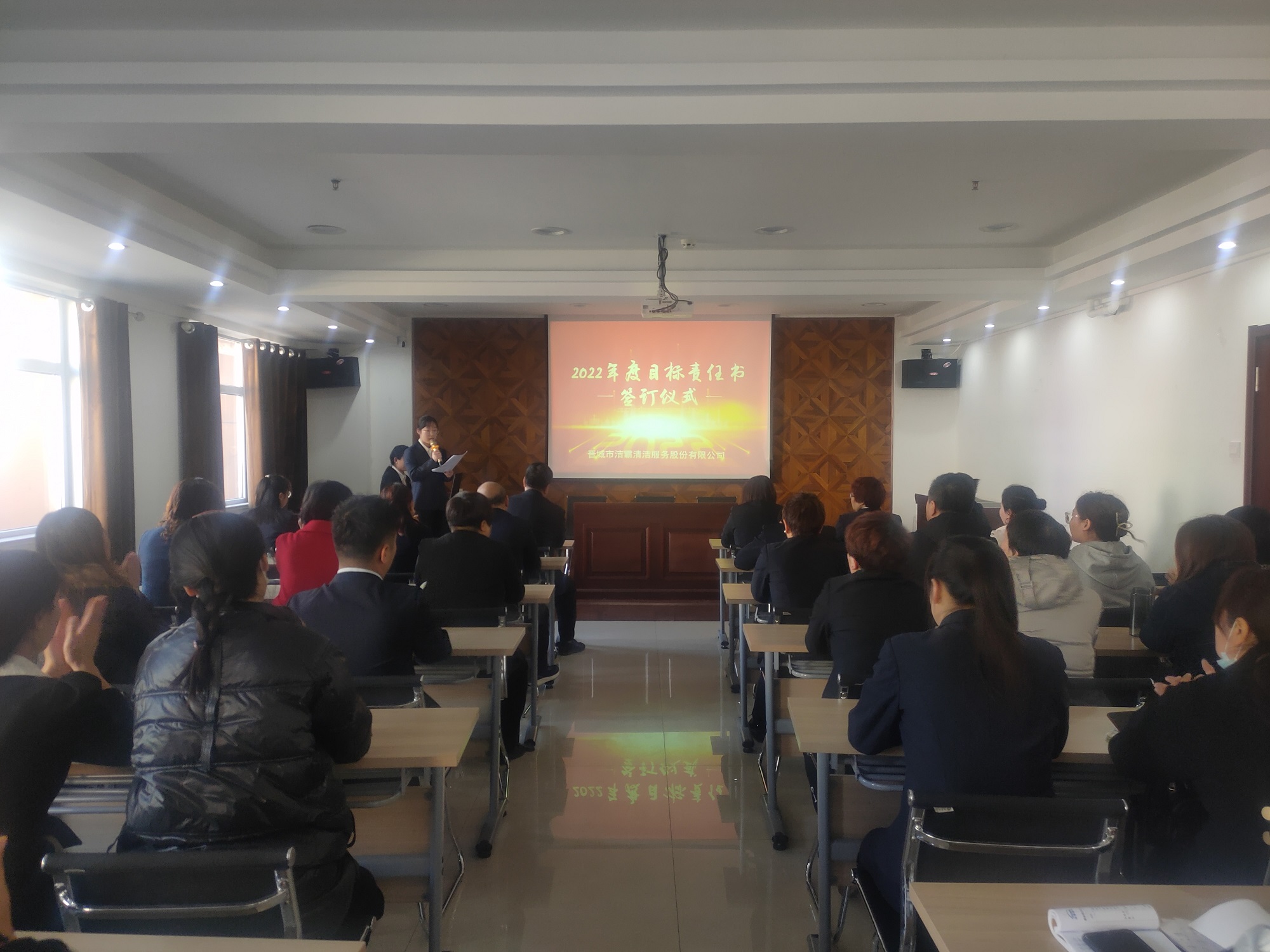 為落實(shí)公司2022年工作會議精神,進(jìn)一步壓實(shí)責(zé)任,確保年度工作目標(biāo)的順利完成, 3月1日下午,晉城市潔霸清潔服務(wù)股份有限公司在活動中心組織召開2022年度目標(biāo)責(zé)任書簽訂會議。公司黨支部書記、總經(jīng)理程晉軍,副總經(jīng)理張永智、史志霞,經(jīng)理助理,各子公司、分公司、部門經(jīng)理及項(xiàng)目負(fù)責(zé)人、主管等參加會議。