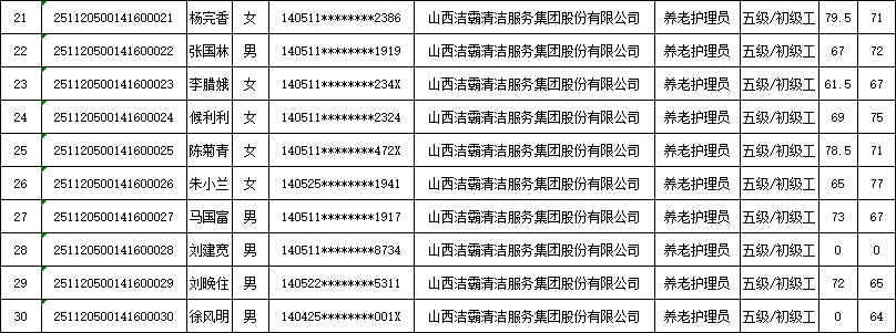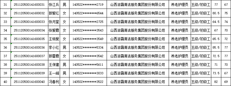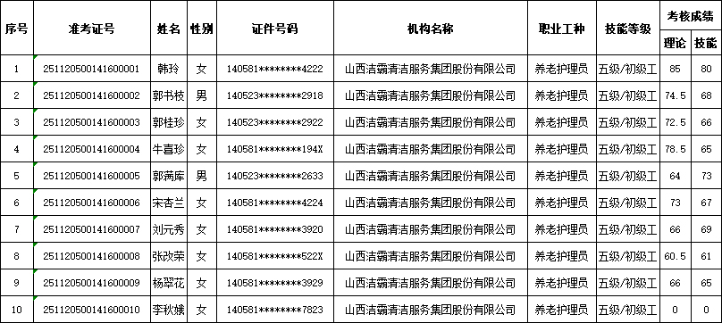 山西潔霸清潔服務(wù)集團股份有限公司職業(yè)技能等級認定中心2025年11月22日第4批養(yǎng)老護理員初級認定人員成績公示